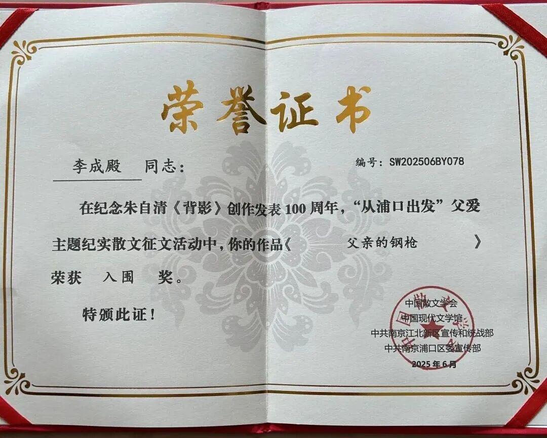 有努力就有收获。2025年6月,我同时收到了两份荣誉:中国散文学会纪念朱自清《背影》创作发表100周年“从浦口出发”父爱主题散文征文活动,《父亲的钢枪》获得“入围奖”;山东散文学会首届“泰山杯”山东老年文学作品大赛,《余晖映晚晴》获得“入围奖”。