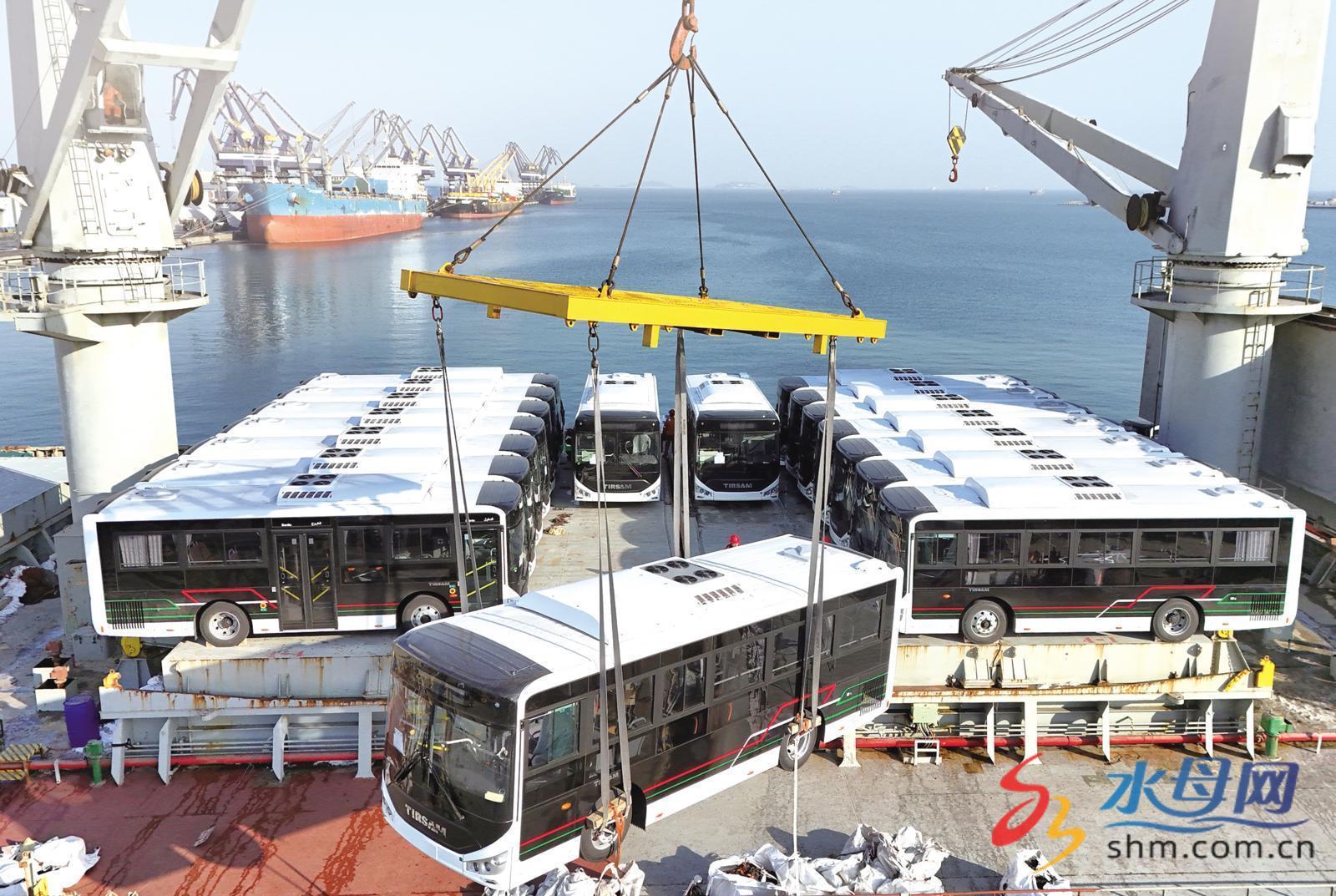 12日,170余辆国产公交车在烟台港装船,跨洋越海发往非洲。YMG全媒体记者 唐克 摄