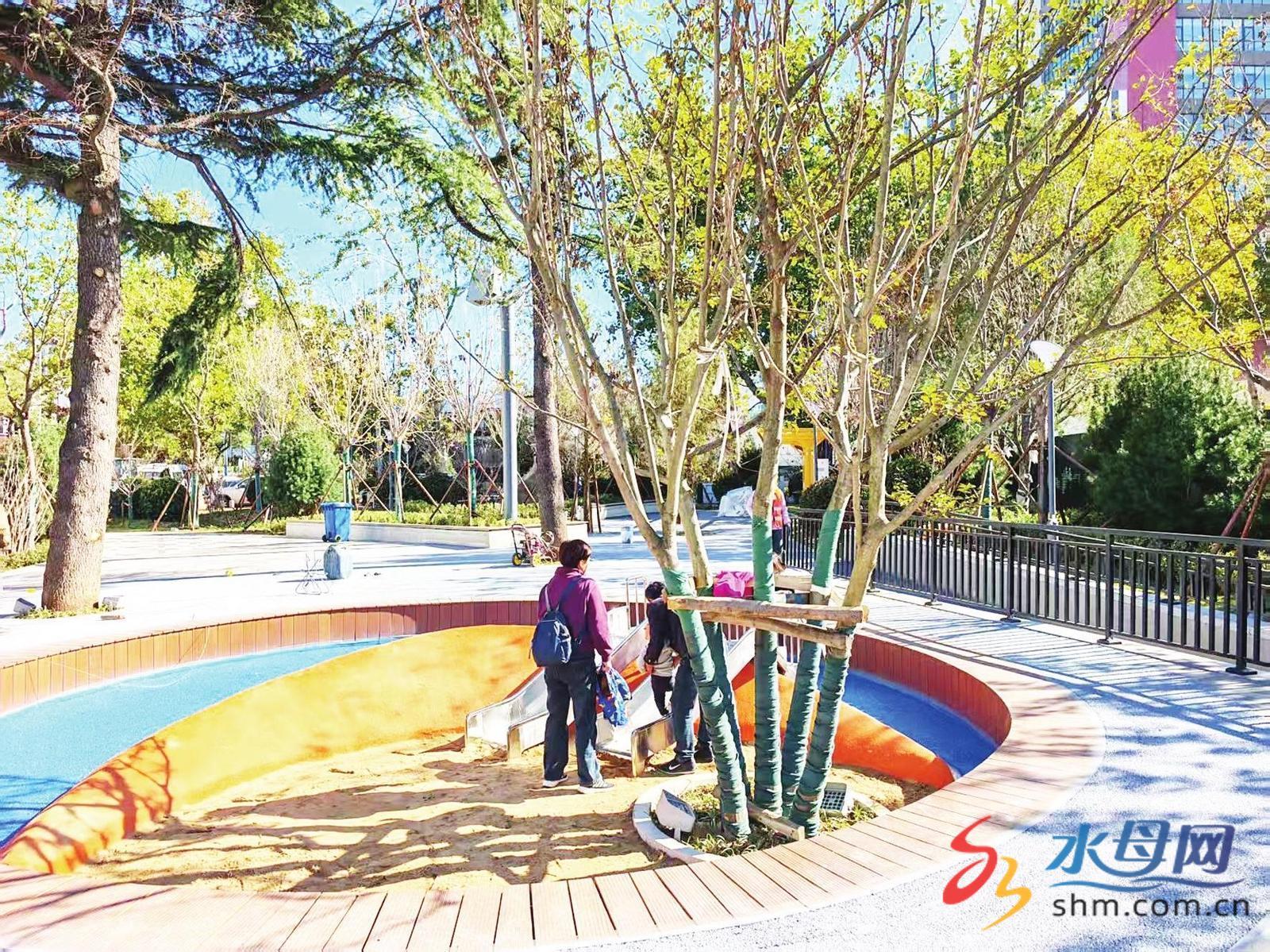 上楼不再犯愁,下楼更别有洞天。在鲁东大学口袋公园,阳光草坪、智慧健身设施、童趣乐园、慢行系统、公园LOGO景墙、雨水花园等一应俱全,书卷气和烟火气无缝衔接。“之前这里一直被围挡遮掩,附近居民都只能‘望地兴叹’,现在老年人能在这里跳广场舞,年轻人也能在智慧单车上试试身手。”居民丁昊说。相似的嬗变,也在西南河路、迎东社区悄然发生,前者将回迁房西侧的撂荒地改造成了“海上生明月”的街头小品,后者则把两块“巴掌大”的绿地,建成了全龄化街头公园,三个圆形场地改造为下沉游乐区,以往只能在小区里蹬着轮滑和单车的孩子们,有了自己的“秀场”。