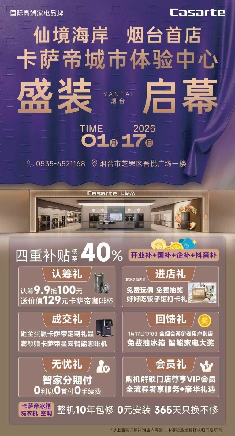 水母网1月16日讯 马跃新春启新程,匠心智造绘华章。当2026年新春的第一缕晨光洒向烟台的山海之间,当胶东“敢闯敢创”的工商传统邂逅中国智造的巅峰技艺,一场定义高端生活美学的盛宴今日璀璨绽放。1月17日,烟台首家卡萨帝城市体验中心即将盛大开业,作为海尔智家集团旗下国际高端家电品牌的战略级布局,该中心不仅填补了港城高端家电场景化体验的市场空白,更以“技艺之巅”的产品实力与“天马开年”的奋进姿态,为“仙境海岸·品重烟台”的城市品牌注入高质量发展新动能。