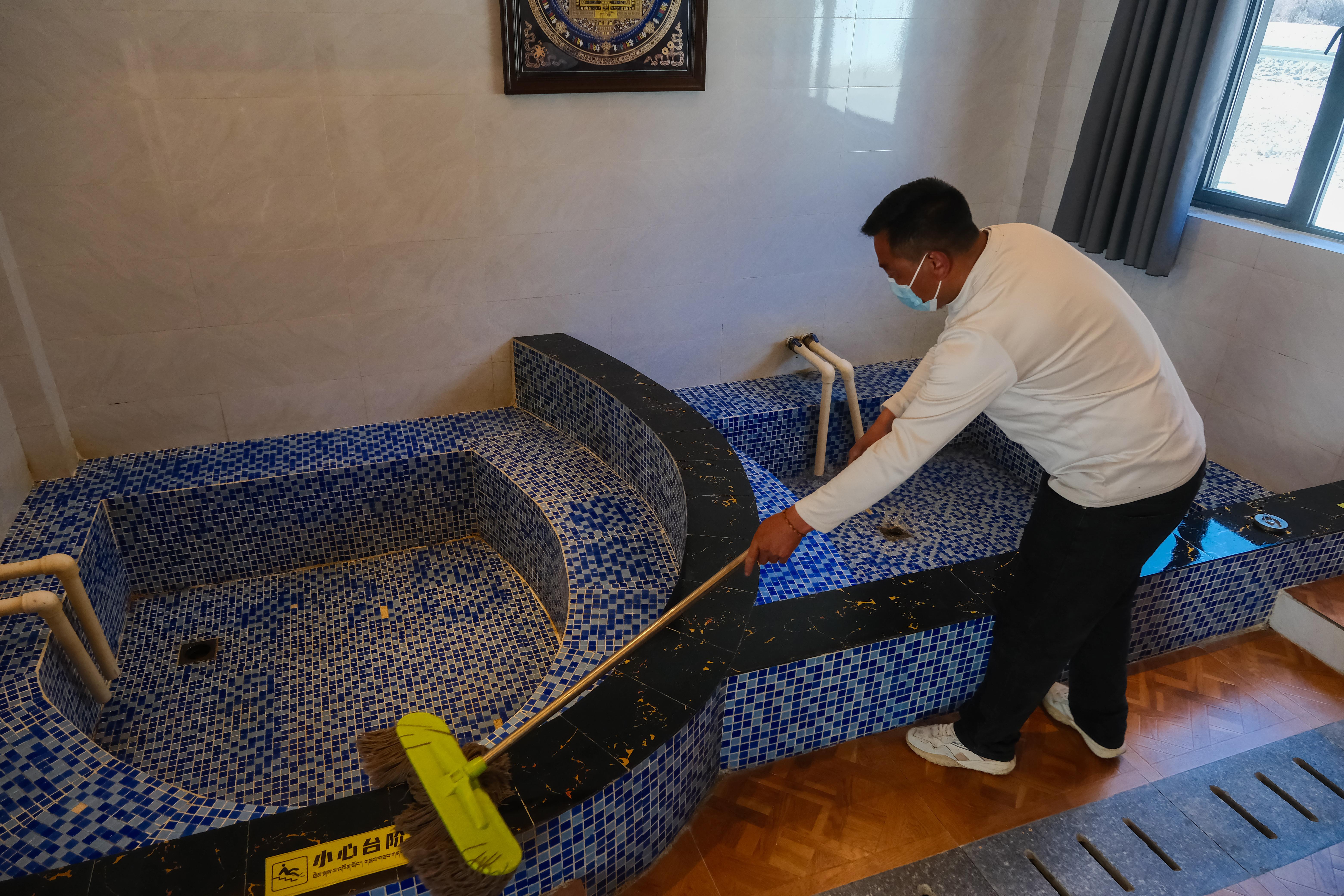 在念朗温泉务工的村民正在清扫温泉包间