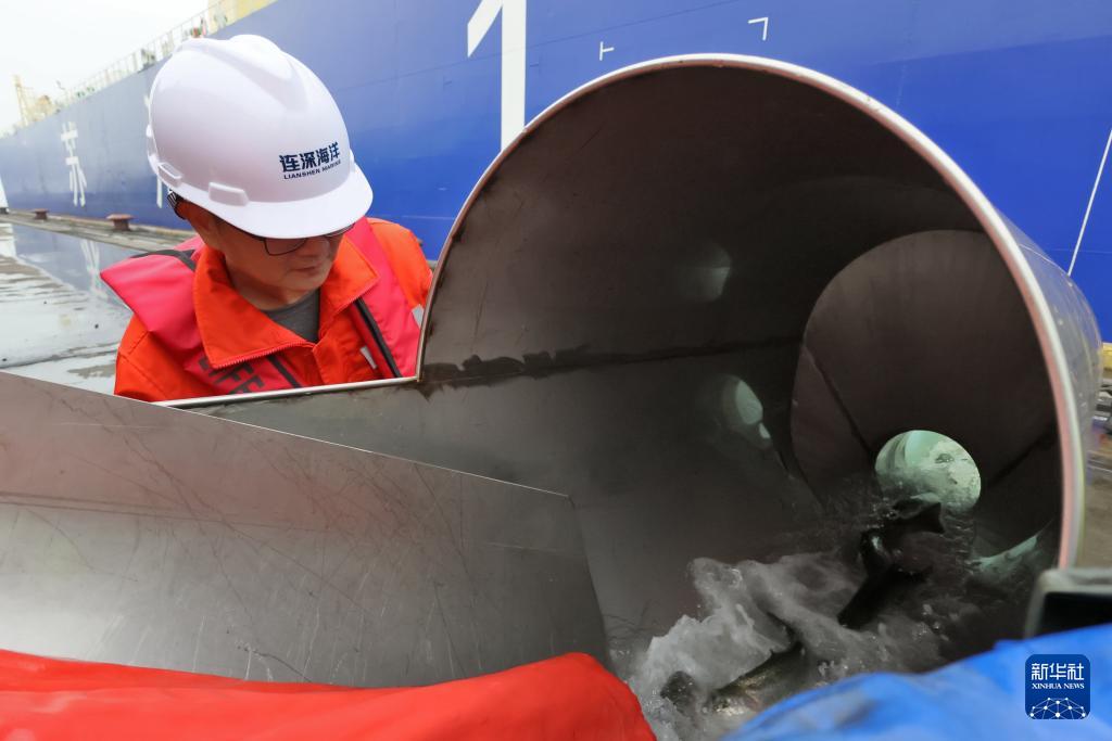 1月16日,在山东港口烟台港,养殖工船“苏海1号”的工作人员察看卸鱼滑槽情况。