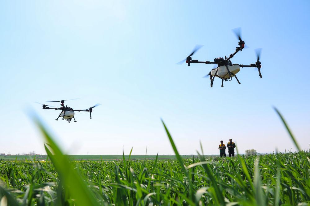 2025年3月20日,在湖北省枣阳市七方镇大房村麦田里,枣阳市顺辉农机专业合作社技术人员操作无人机进行植保作业。新华社发(杨东摄)