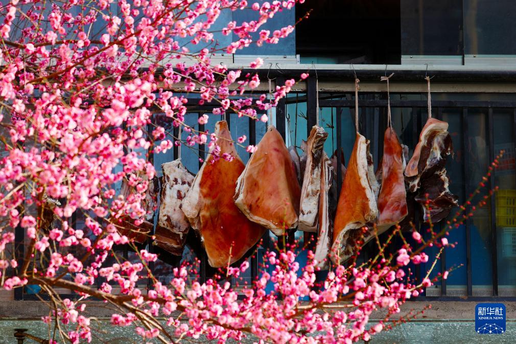 1月13日拍摄的梅花掩映着重庆市黔江区伴山国际小区居民窗口的过年腊肉。