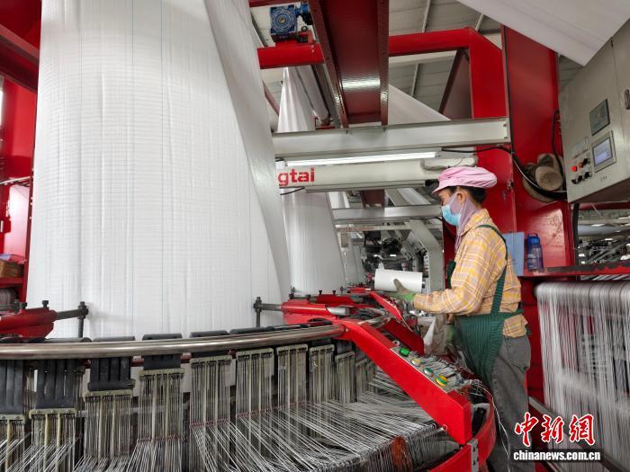 1月13日,儋州伟达化工有限公司生产车间内,工人正利用上游企业生产的聚乙烯开展再加工,制作集装吨袋。 中新社记者 王子谦 摄
