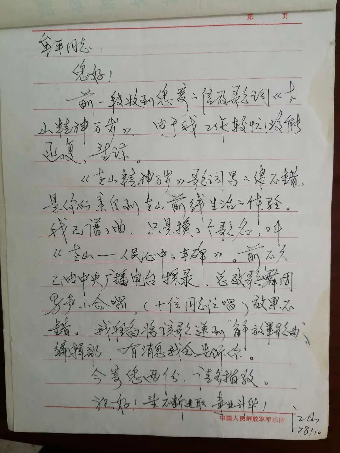 那是1985年3月,我以炮团枪械维修工的身份,参加了老山前线防御作战,在临时驻地和前沿阵地待了七个月后,被选调到后勤机关军械股任保管员。在前线,军械保管员的一项重要职责就是保障弹药供应。由于隔三岔五就要带车到几十里外的弹药库拉送炮弹和回收品,一路颠簸,一路风尘,一路劳顿。有了这种生活体验,我有感而发,于1986年春节期间创作出一首《我自豪,我是野战司机》的歌词,历经数次修改,感到满意后,便不知天高地厚,也是抱着试试看的心理寄给了沈阳军区前进歌舞团铁源老师。就在我沮丧地认为词稿再一次“石沉大海”之际,一封来自沈阳军区前进歌舞团的信让我眼前一亮,但忐忑的心却在嘀咕:该不是又一封退稿或婉拒信吧?当小心地打开信封,展开信笺,一看落款“铁源”两字,我就起了一惊,一股暖流也随之涌遍全身。