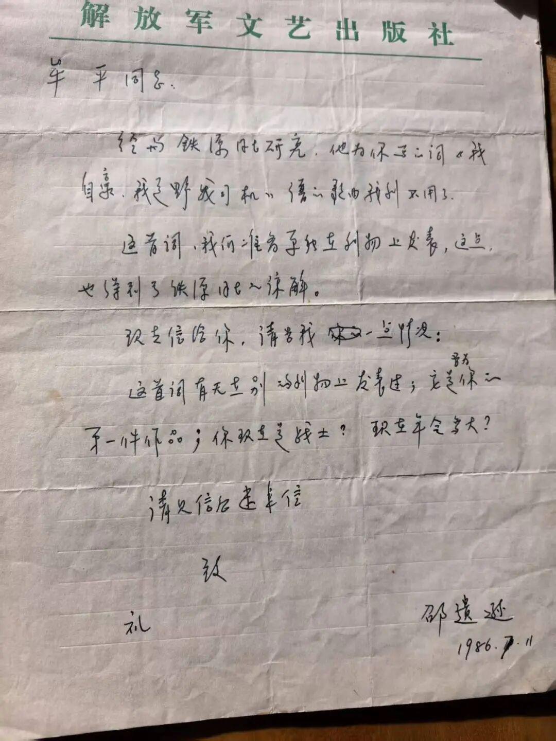 遗憾的是,7月11日,我收到了《解放军歌曲》杂志社邵遗逊编辑的来信:“经与铁源同志研究,他为你写的词《我自豪,我是野战司机》谱的歌曲我刊不用了。这首词,我们准备单独在刊物上发表,这点,也得到了铁源同志的谅解。现去信给你,请告诉我一点情况:这首词有无在别的刊物上发表?它是否为你的第一件作品?你现在是战士?年龄有多大?”