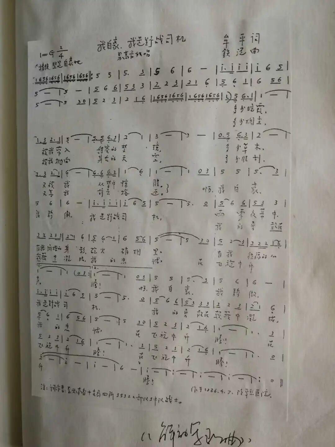 铁源老师在信中写道:“来信收到后,因外出一段时间,没能回信,请谅。您的《我自豪,我是野战司机》我做了个别改动,谱了曲,在寄给您的同时也寄《解放军歌曲》一份,请他们看能否发表。作为普通的演唱,可以把高音2以后9小节去掉,在它的前面结束……请把你们唱后的感觉和意见告我。祝你们多打胜仗,多立战功——1986年4月8日于沈阳。”