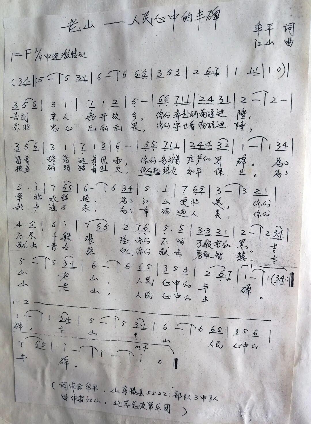 我结缘的第三位名家是江山老师。江山老师是解放军总政军乐团的一位女高音歌唱家,我是在快结束防御作战任务时,突发奇想创作了一首“大题材”的歌词《老山精神万岁》,偶尔看到《解放军报》上登载江山老师作曲的一首队列歌曲后,就斗胆给她寄去了歌词。没承想,我刚退役回家,部队通讯员即转来了江山老师1986年10月28日写给我的第一封信和为词谱曲的原稿。她说:“《老山精神万岁》歌词写得很不错,是你们亲自到老山前线生活的体验。我已谱了曲,只是换了个歌名,叫《老山,人民心中的丰碑》。前不久已由中央人民广播电台采录,总政歌舞团男声小合唱(十人组),效果不错……”