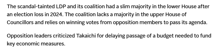 美联社的报道认为,高市提前解散众议院并举行大选的举动是试图利用其高支持率,帮近年来屡屡在大选中受挫的自民党“收复失地”,而不顾此举会导致众议院推迟批准一份旨在提振日本疲软的经济、应对物价飞涨的预算案。报道注意到,丑闻缠身的自民党及其执政联盟在日本众议院仅占微弱多数,在参议院则不占多数,要依靠赢得反对党议员的选票来通过其议程;而反对党领导人则批评高市早苗耽误了为关键经济举措提供资金的预算案的通过。