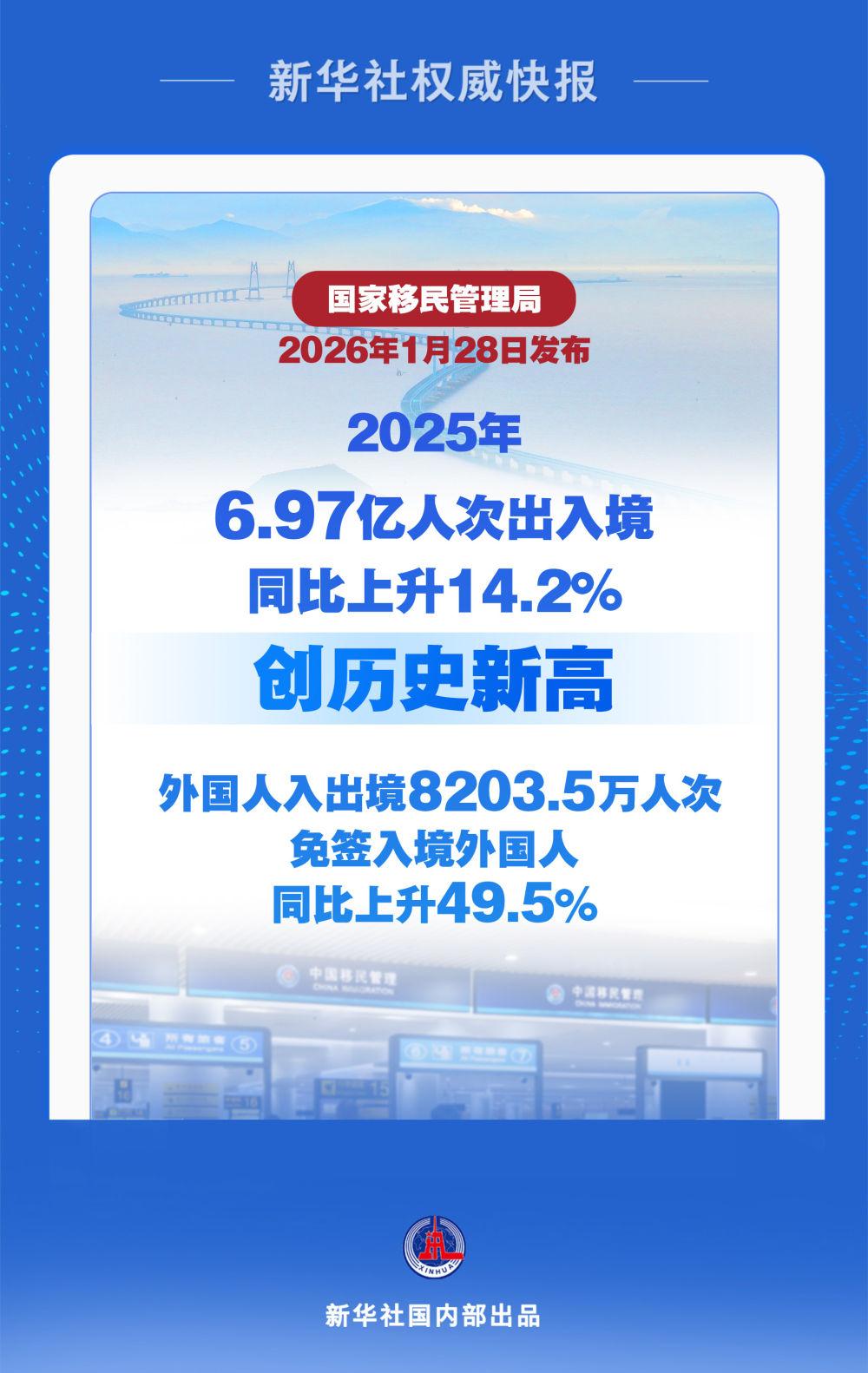 记者1月28日从国家移民管理局新闻发布会获悉,2025年,全国移民管理机构共查验出入境人员6.97亿人次,同比上升14.2%,创历史新高。其中,内地(大陆)居民3.35亿人次、港澳台居民2.79亿人次,同比分别上升15.1%、10.1%;外国人8203.5万人次、同比上升26.4%,免签入境外国人3008万人次、占入境外国人73.1%、同比上升49.5%。