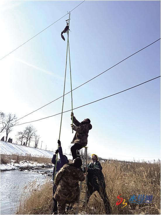 在尝试了多种角度和力度近一个小时后,现场救助人员双手已被冻得麻木。考虑到被困鸟儿已长时间悬挂,体力透支严重,如果此时放弃或拖延,鸟儿随时面临失温死亡的风险。在多次商讨方案后,大家决定放手一搏。救助人员冒着危险,踩着松软湿滑的河岸沙土,合力架起人字梯作为支撑点。两名工作人员在梯下死死扶住底座,两名电力专业人员利用两支加长绝缘长杆接力延伸。大家咬牙坚持,通过多次尝试,终于成功将受困鸟儿安全救下。