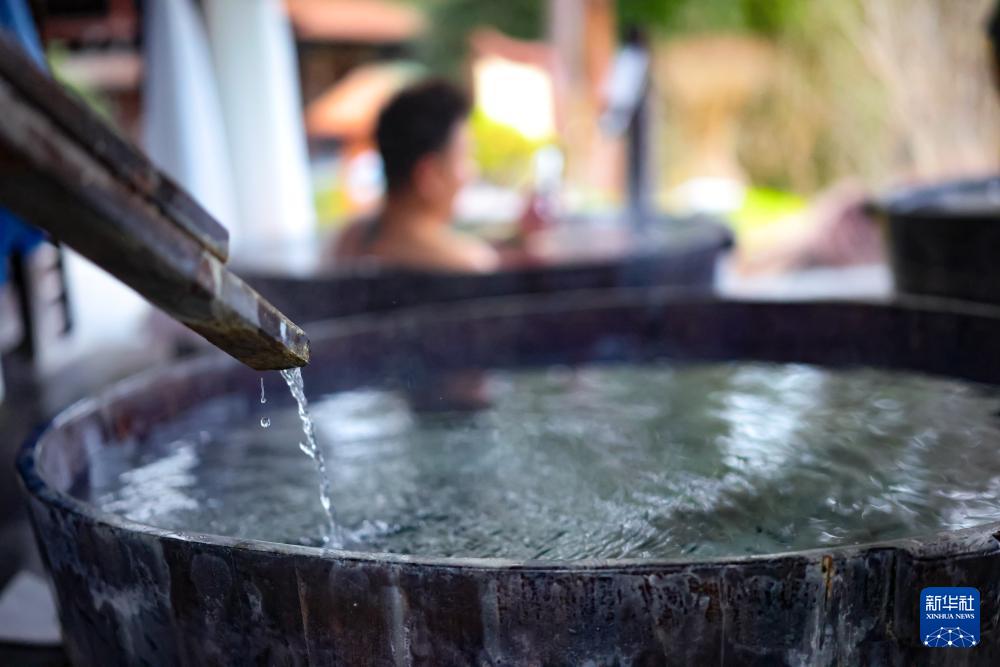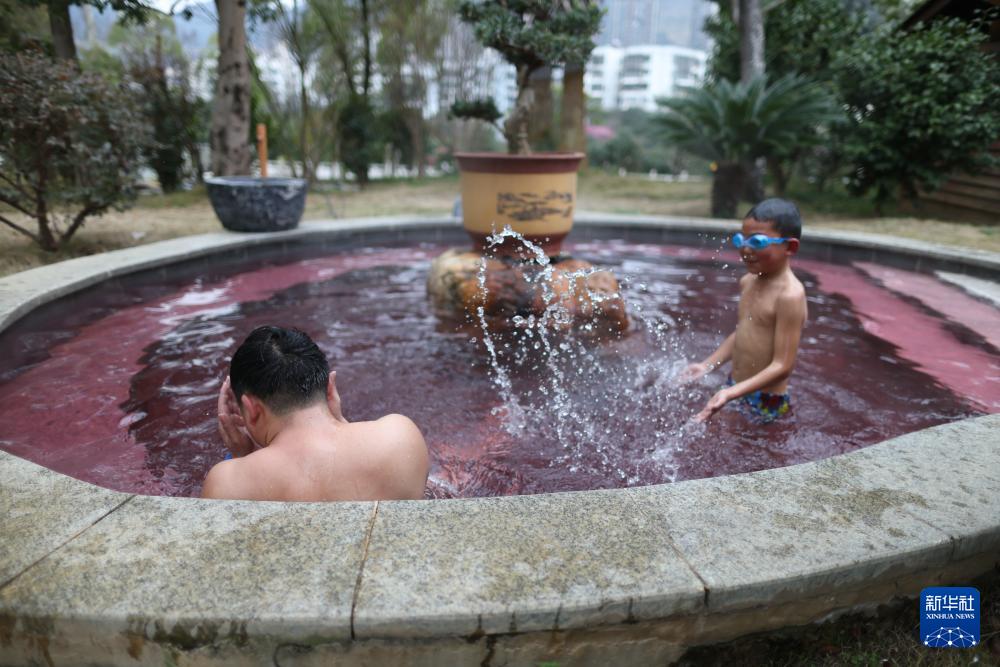 游客在石阡县体验放有中药药液的温泉(1月27日摄)。