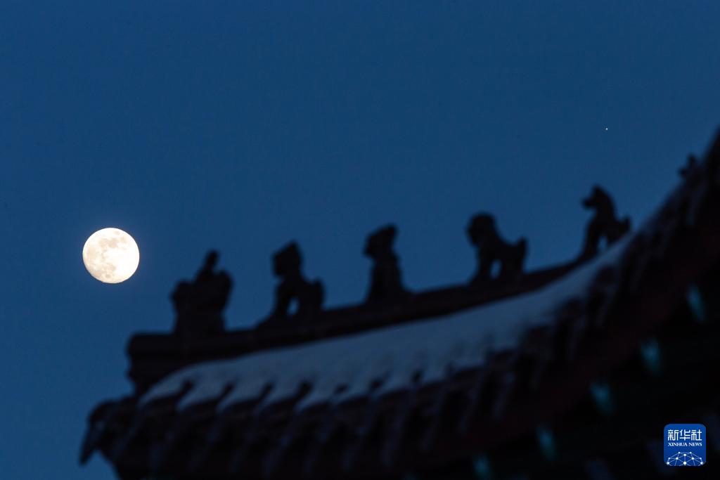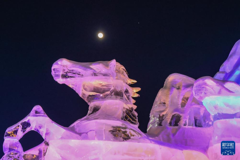 1月31日,在黑龙江省嘉荫县,冰雕与木星伴凸月相映成趣。