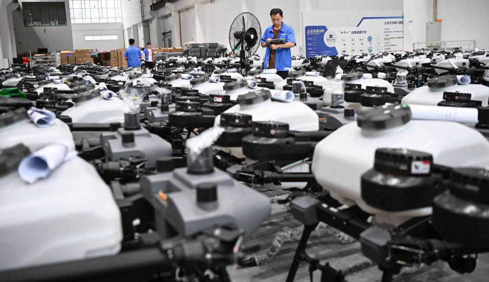 2025年6月26日,工作人员在联合飞机集团深圳基地植保无人机仓库内巡视。新华社记者 邓华 摄