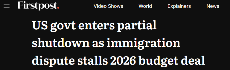 这是自去年11月12日结束的美国历史上最长联邦政府“停摆”(持续43天)以来,政府再度陷入部分“停摆”。虽然预计此次“停摆”时间将大幅缩短,但若无法迅速解决,部分联邦雇员或将无薪工作,其余人员则可能被迫无薪休假。福克斯新闻首席国会记者查德·珀格拉姆表示:“此次‘停摆’预计至少将延长至近90小时——前提是众议院能在2月2日与参议院达成一致。”