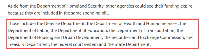 据路透社报道,美国国会每年需为438个联邦机构拨款,若未能履行该职责,相关机构必须停止所有非必要工作。此次部分“停摆”涉及多个关键部门,包括美国卫生与公众服务部、交通部、证券交易委员会、财政部、联邦法院系统等。