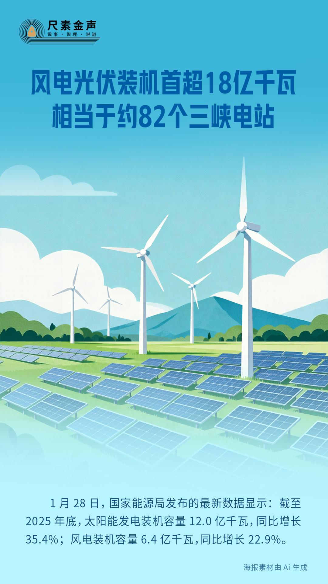 1月28日,国家能源局发布的最新数据显示:截至2025年底,太阳能发电装机容量12.0亿千瓦,同比增长35.4%;风电装机容量6.4亿千瓦,同比增长22.9%。