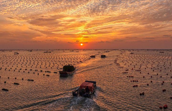 2025年10月24日,在山东省荣成市爱伦湾鲍鱼养殖区,收获鲍鱼的养殖户驾驶船只返回渔港(无人机照片)。新华社发(李信君 摄)