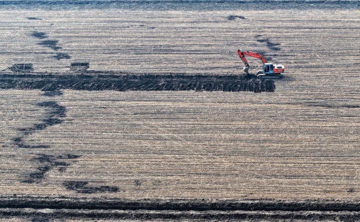 2025年3月11日,在天津市津南区八里台镇大韩庄村,工人驾驶挖掘机进行高标准农田施工作业(无人机照片)。新华社记者 赵子硕 摄