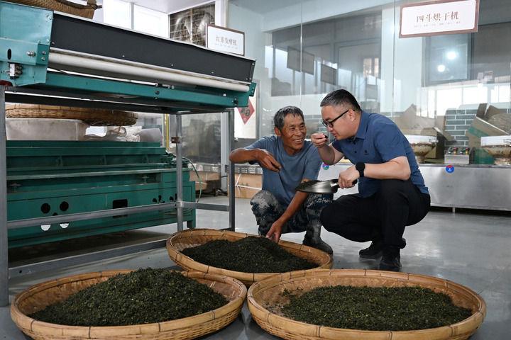 2025年5月25日,在山东省日照市五莲县丁家楼子村,第一书记郑勇山(右)在村里的茶叶合作社查看茶叶品质。新华社记者 马宁 摄