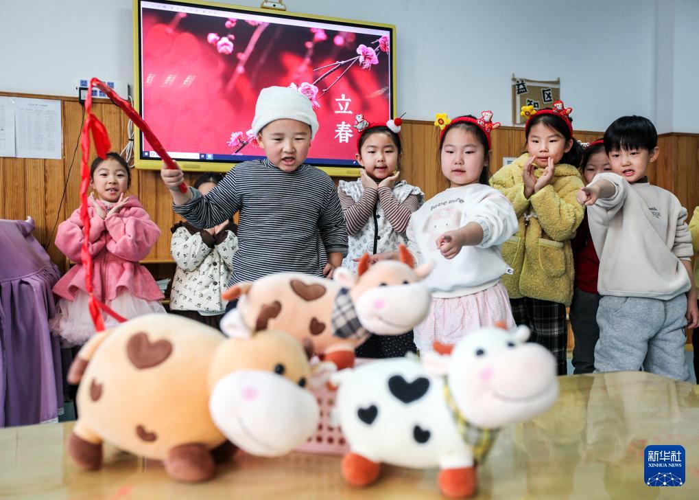 2月4日,在河南省焦作市博爱县县直幼儿园,小朋友做“打春牛”游戏。