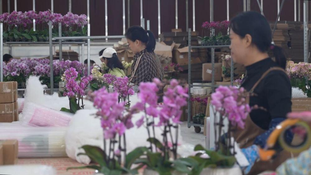 临近新春佳节,年宵花市场已经开始逐渐升温。这家公司近期以来每日都有几千件快递发出,有五六十名居住在周边、灵活就业的工人每天都忙碌着打包。