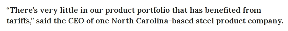 尽管特朗普政府坚称,关税政策将使企业在美国本土生产商品,避免为进口原材料支付更多费用,消费者也会看到价格下降。然而,位于北卡罗来纳州的钢铁制品企业英斯蒂尔工业的首席执行官霍华德·沃尔茨(H.O. Woltz III)直言:“我们产品中受益于关税的类别非常之少。”