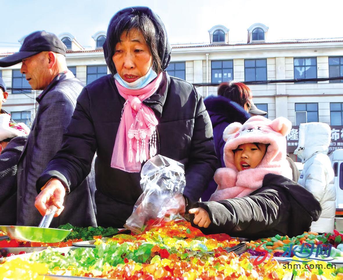 近日,在牟平区的高陵大集上,一位奶奶正领着小孙女选购五颜六色的糖果。