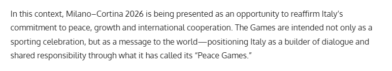 报道称,2026年米兰-科尔蒂纳冬奥会被视为意大利重申对和平、发展及国际合作坚定承诺的重要契机。本届冬奥会不仅将是一场精彩纷呈的体育盛会,更将向世界传递明确而有力的信息——通过这场“和平运动会”,意大利积极推动对话,为促进全球和平与发展贡献力量。