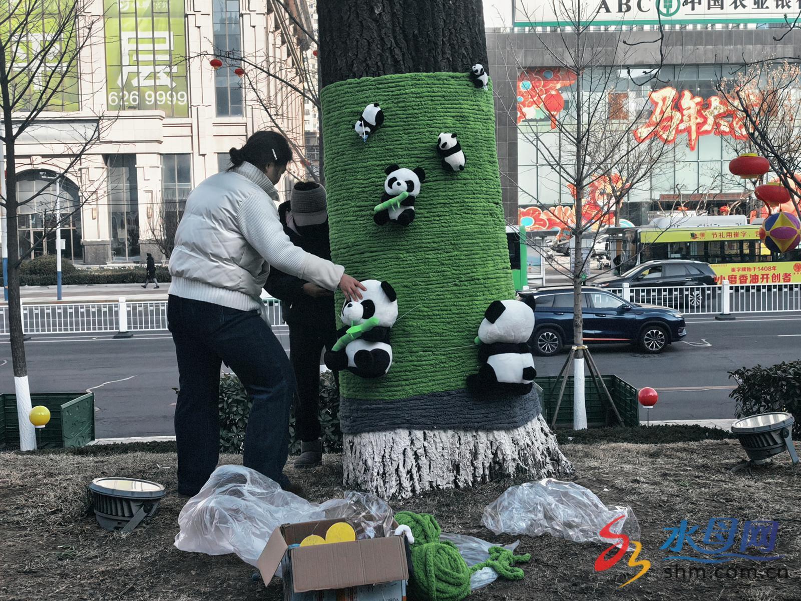 “看,这么多‘熊猫’在爬树!”一位小朋友兴奋地摸着毛茸茸的熊猫织饰。不多时,一棵棵树陆续穿上了“定制新衣”,原本开阔的广场瞬间弥漫着暖意与烟火气。