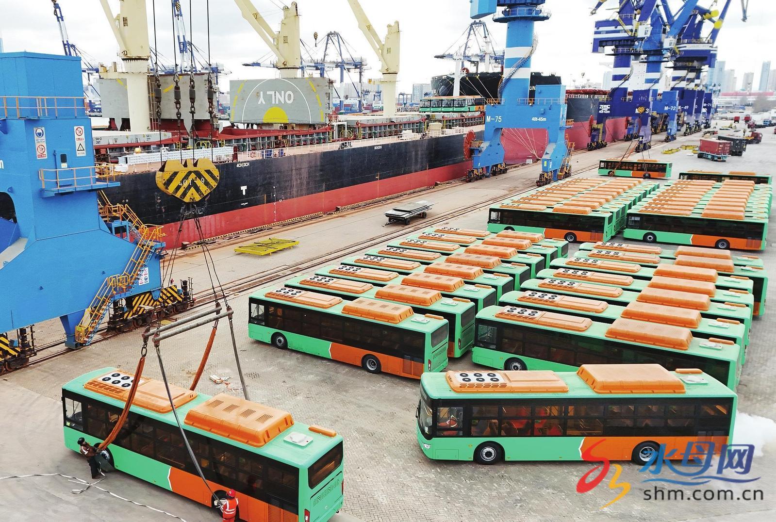 2月7日,100台出口墨西哥的天然气公交车在山东港口烟台港完成装船并启程。