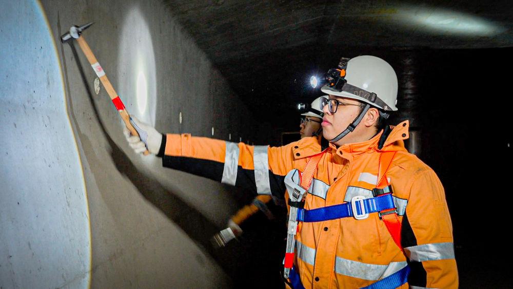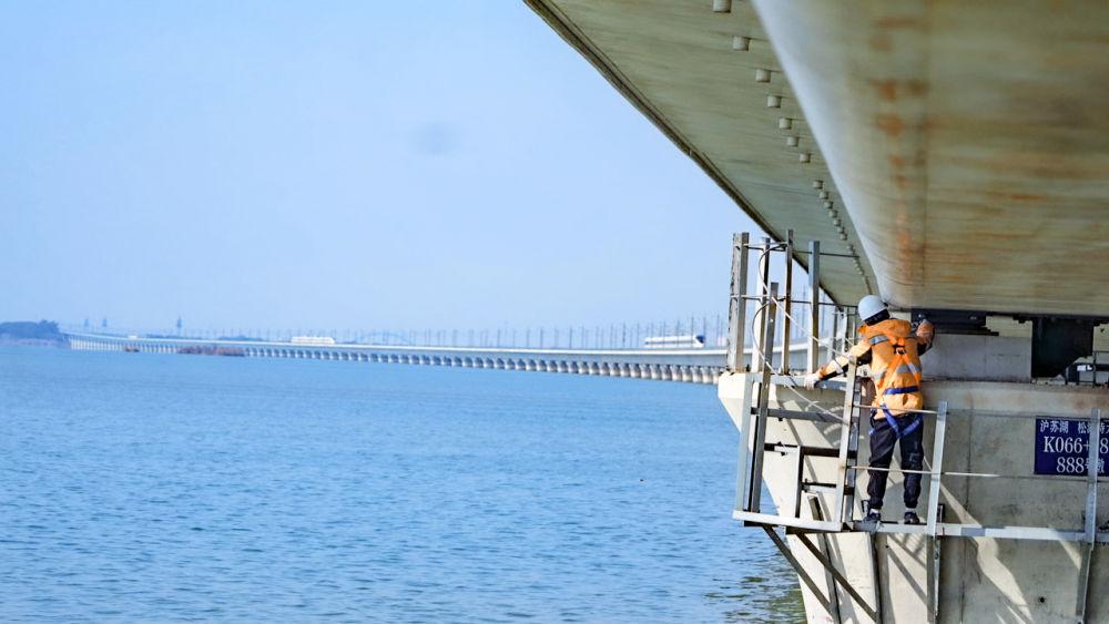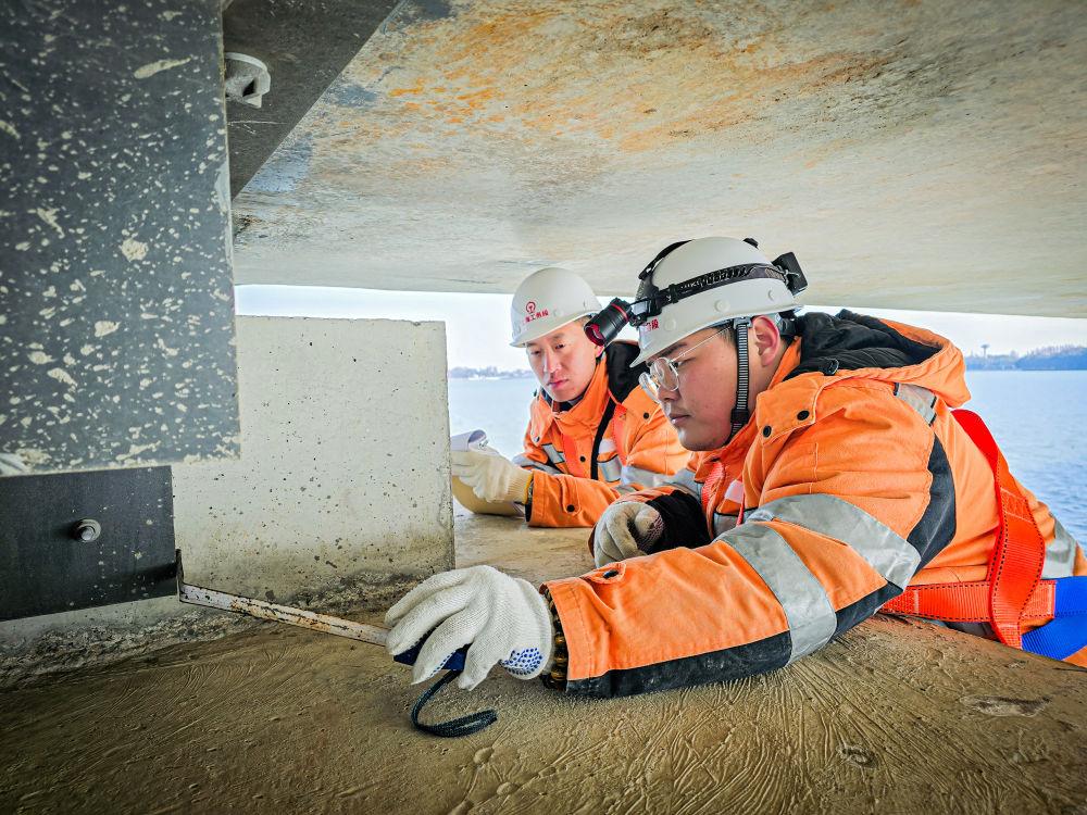 桥体间的缝隙狭窄,进入大桥内部后更是伸手不见五指。上海高铁基础设施段湖州车间桥梁组工作人员借着头灯的光线,像啄木鸟为树木问诊一般,沿梁体一路进行听诊式的检查。