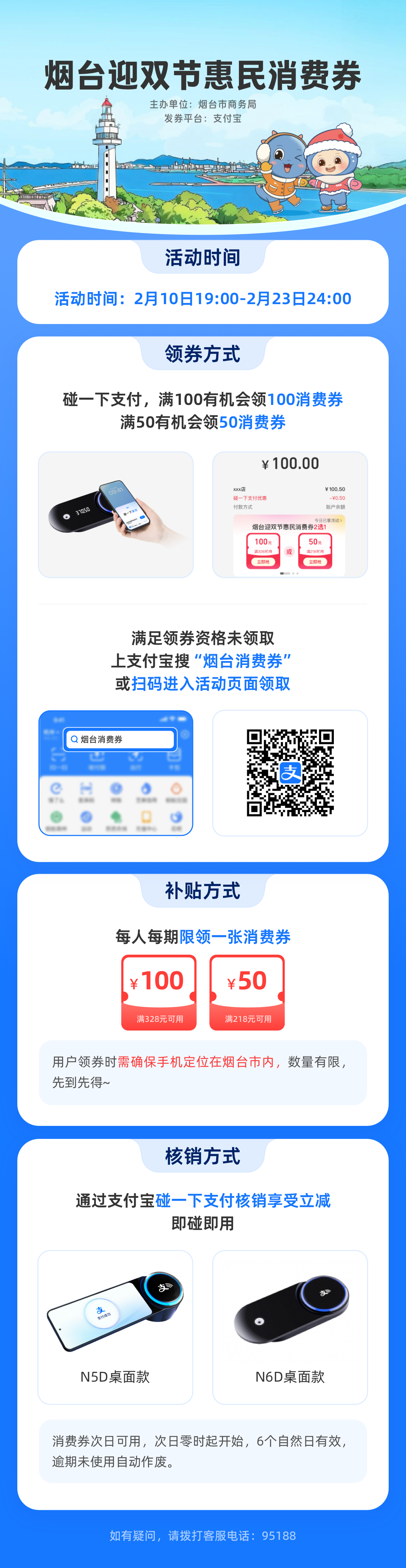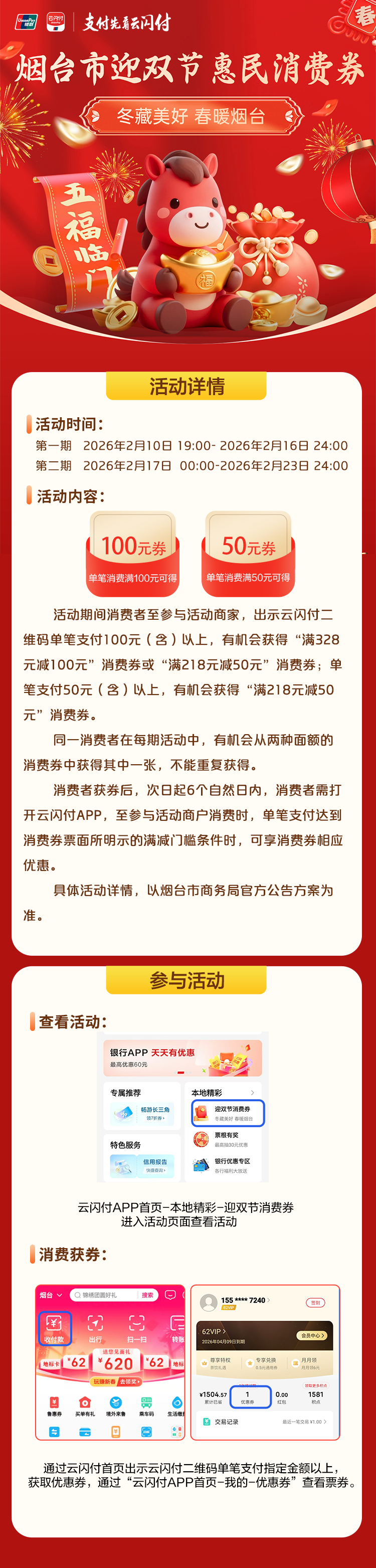 水母网2月10日讯 新春佳节将至,为持续释放消费潜力,给市民带来真真正正的福利,烟台市于2月10日至23日开展第二期迎双节惠民消费券活动。