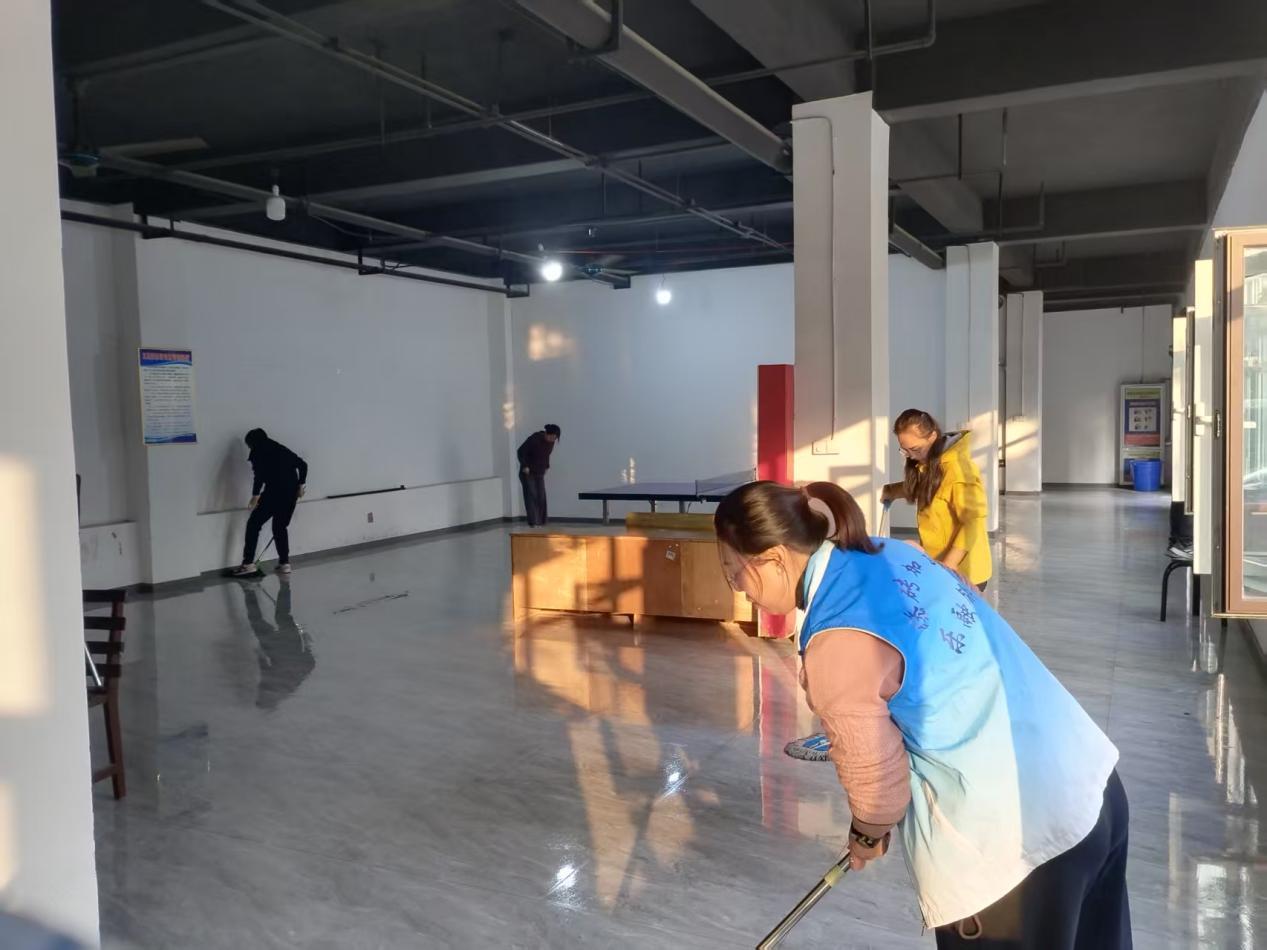 面对挑战,服务站工作人员与志愿者们迅速分工,各司其职。有的手持扫帚,仔细清扫地面每一寸角落,不放过一丝灰尘;有的拎起拖把,将地面拖得光洁如镜,映出人影;还有的则专注于擦拭桌椅,确保每一处细节都一尘不染。最引人注目的是志愿者们对玻璃的精心擦拭,他们先用清水打湿抹布,再一点点地擦拭玻璃表面,最后用干布抛光,原本模糊不清的玻璃瞬间变得明亮通透,仿佛为活动室打开了一扇通往新世界的窗。
