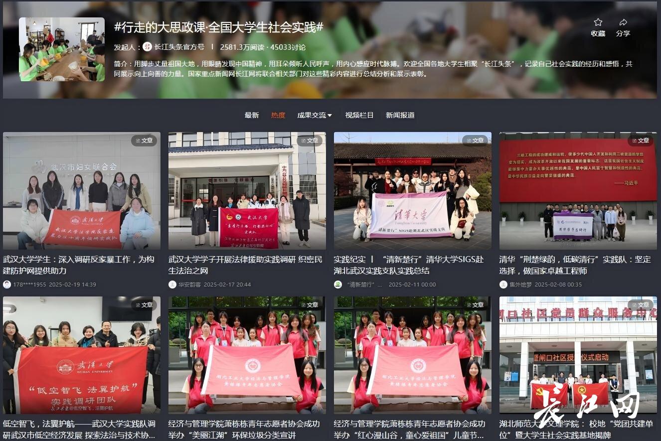 自2022年以来,长江网依托“长江头条”率先发起“行走的大思政课”全国大学生社会实践网络互动话题,2025年该品牌持续升级,迭代为集资源对接、成果展示、交流共享于一体的综合育人阵地。