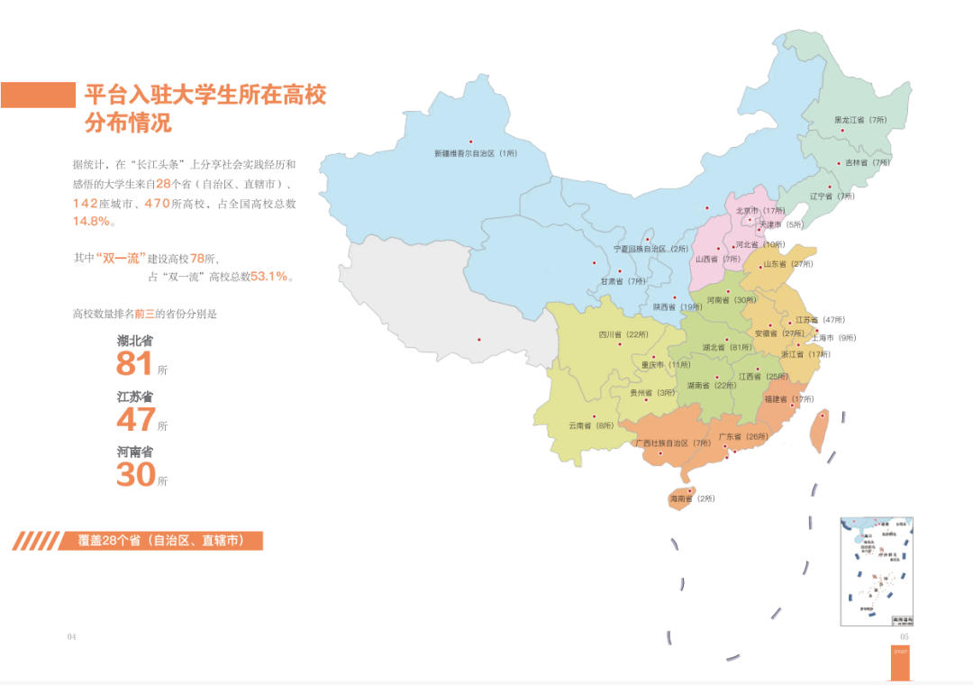 报告显示,该平台已吸引来自全国28个省(自治区、直辖市)142座城市共计470所高校的学生自发入驻长江头条,占全国高校总数的14.8%。其中,“双一流”建设高校达78所,占全部“双一流”建设高校的53.1%。从地域分布看,吸引的高校数量排名前三的省份分别为湖北省(81所)、江苏省(47所)和河南省(30所)。