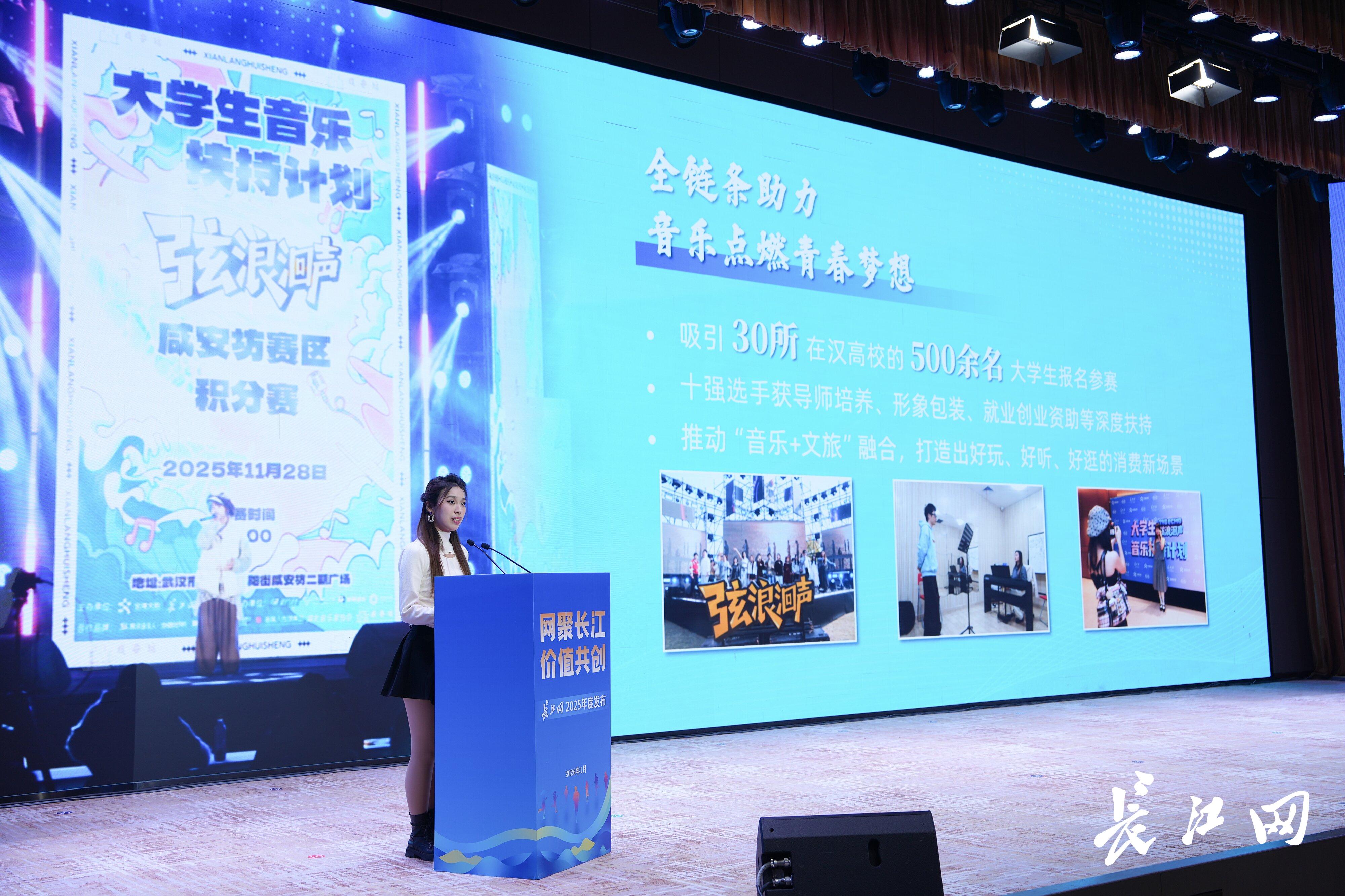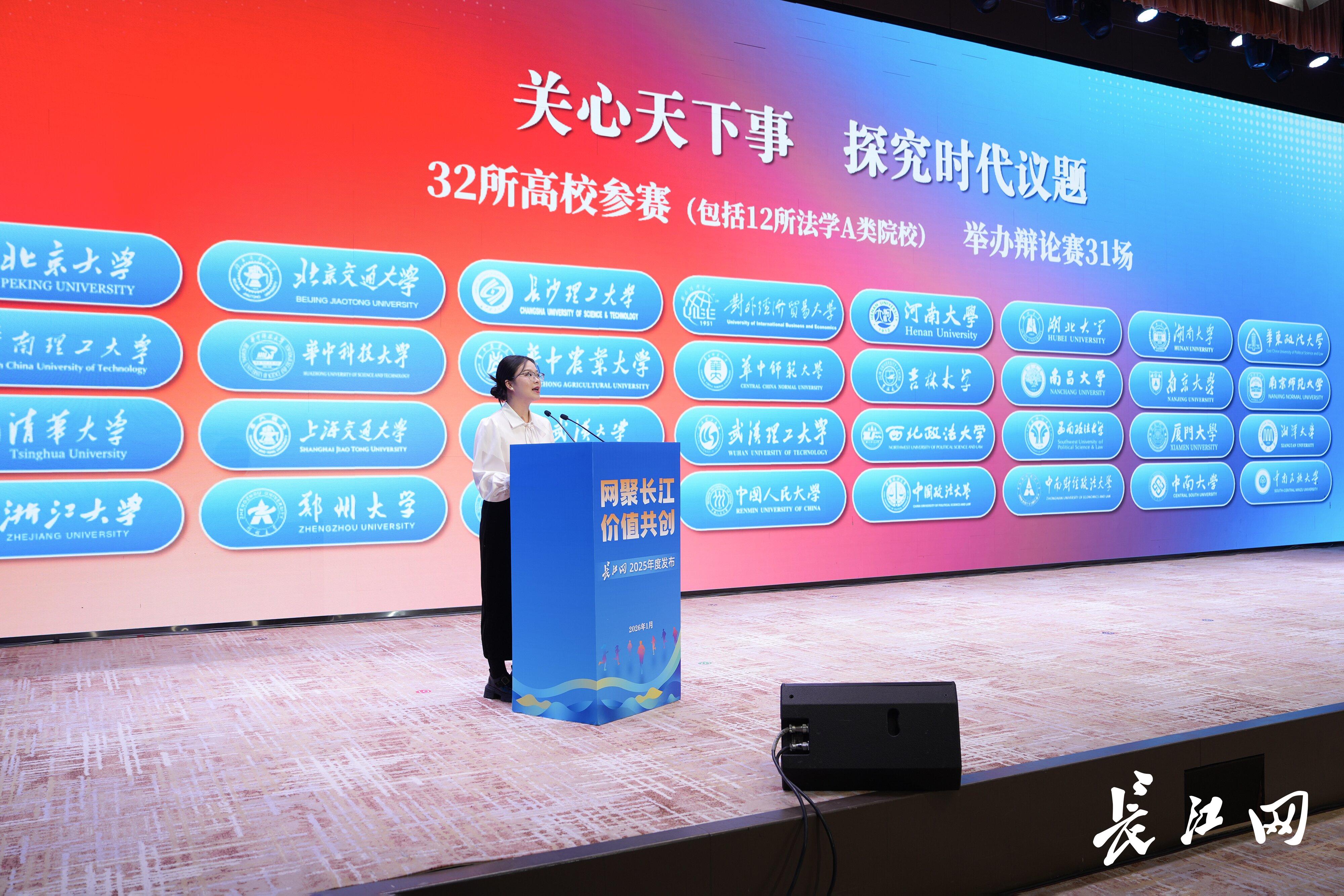 1月31日,“网聚长江 价值共创——长江网2025年度发布”活动举行,江汉大学马克思主义学院2023级学科思政专业硕士研究生胡欣然、中南财经政法大学法学院“1+3”辅导员胡颜、湖北大学新闻传播学院2024级播音与主持艺术专业本科生周慧钰等3位高校师生代表,分别以“青春行走”“青春思辨”“青春声浪”为主题,现场发布《“行走的大思政课”长江头条全国大学生社会实践活动报告(2025年度)》。