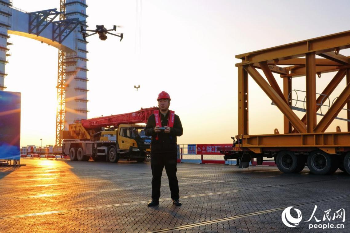 刘国政说,塔吊吊装的钢壳是大桥“搭积木”时必不可少的“元件”,像这样的“元件”共有60个。在他和同事们的精准操控下,它们被一节一节地吊起来、整齐堆叠。