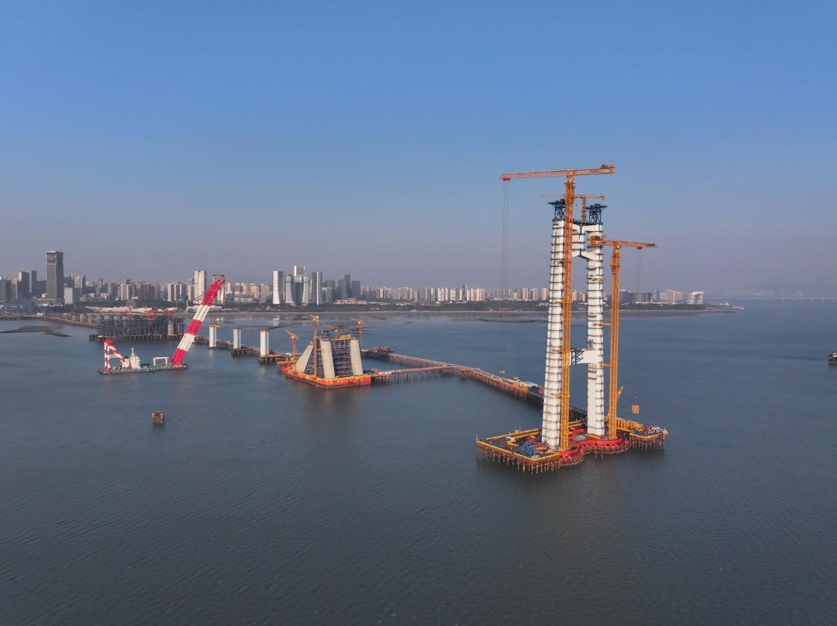 2025年底,厦金大桥(厦门段)的两座主塔相继封顶。今年春节期间,大桥建设者们依然“不停工”,白班、夜班两班倒,为后续主缆架设、钢箱梁架设等工作做准备。