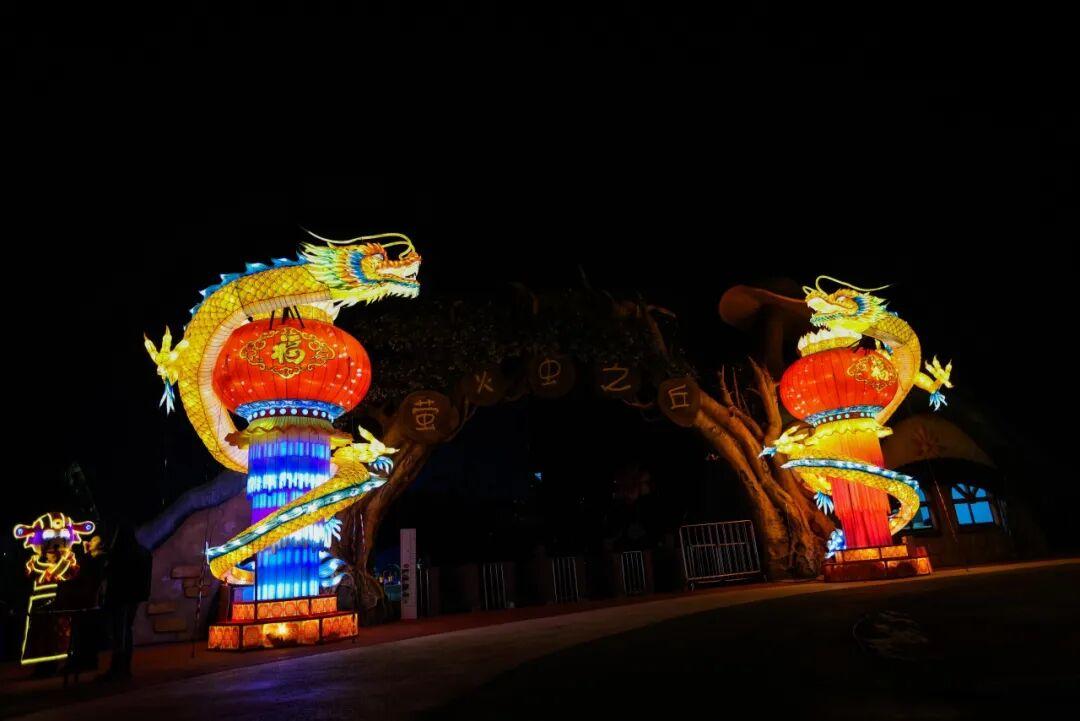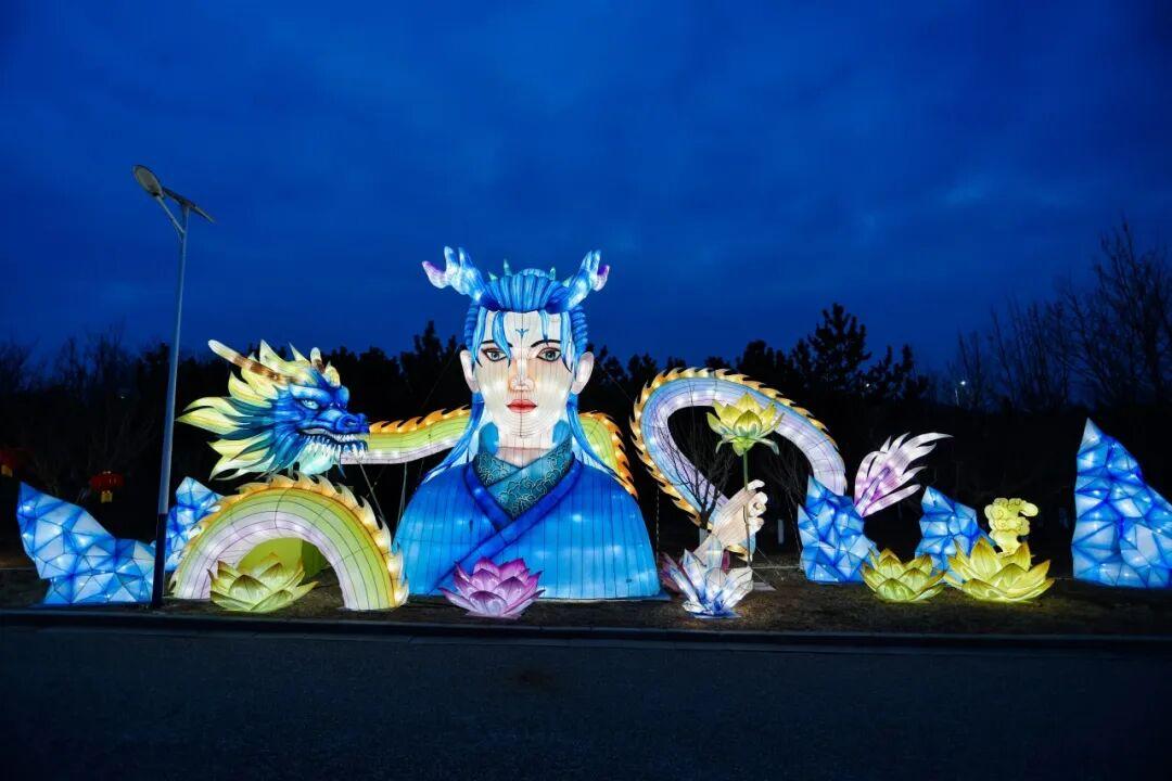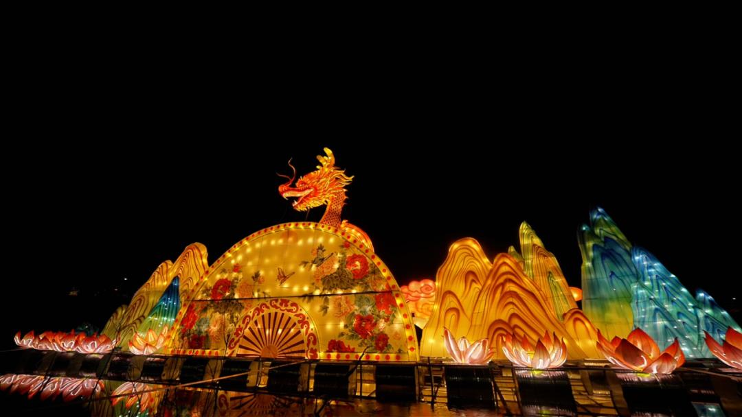 凤栖湖畔,山海经系列灯组区域,还可最近距离观赏水上22米长超大“飞龙在天”灯组。