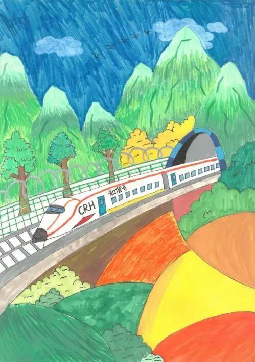 列车穿行青山间。(作者:馨馨小朋友 9岁)