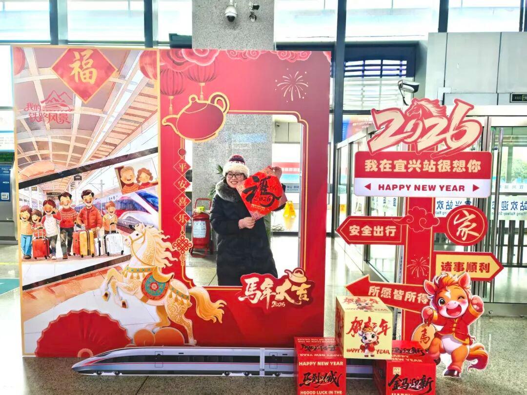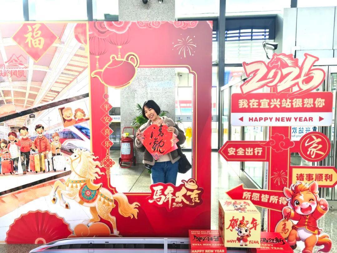 旅客在宜兴站拿着“福”字拍照打卡。