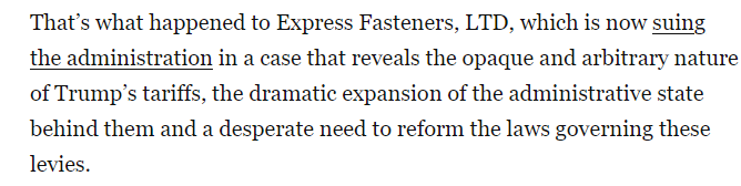 文章称,最近伊利诺伊州一家螺母、螺栓和螺丝供应商Express Fasteners正在起诉政府,此案表明美国政府关税政策的不透明性和任意性,其背后反映出行政机构的急剧扩张,以及改革管理这些关税法律的迫切性。