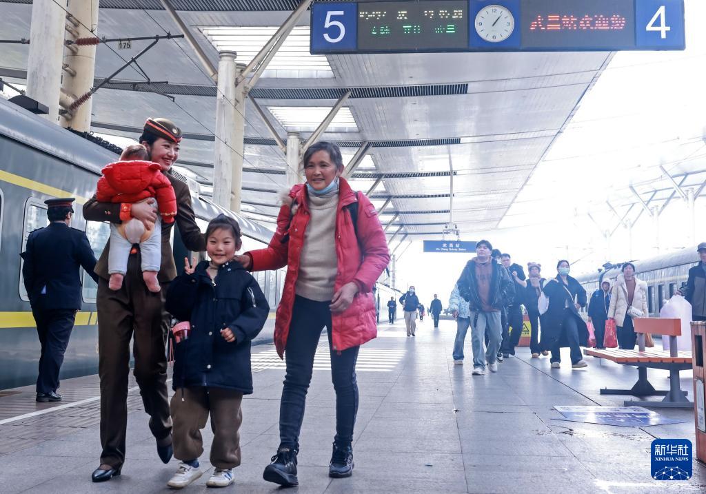 2月13日,在湖北省武昌站,武汉铁路志愿者协助旅客乘车出行。