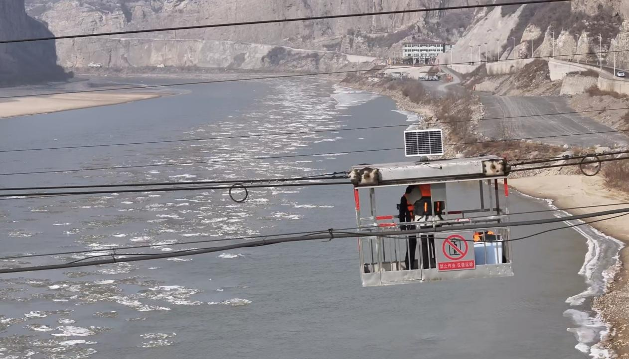 横跨东西两岸的钢索吊箱正在把人运往龙门水文站