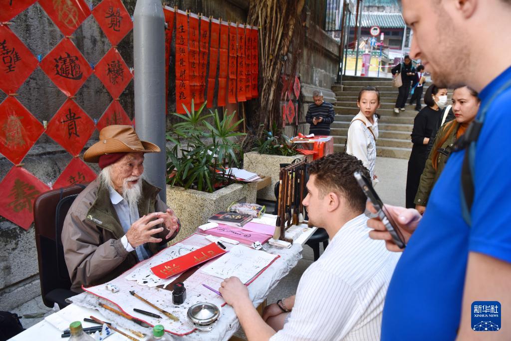 “在街头写字,面对的是全世界的人,哪怕只是有人停下看一眼、问一句,都是在传播文化。”萧嘉豪说,这里背靠文武庙、毗邻摩罗街,成了展示中华传统文化的鲜活窗口。