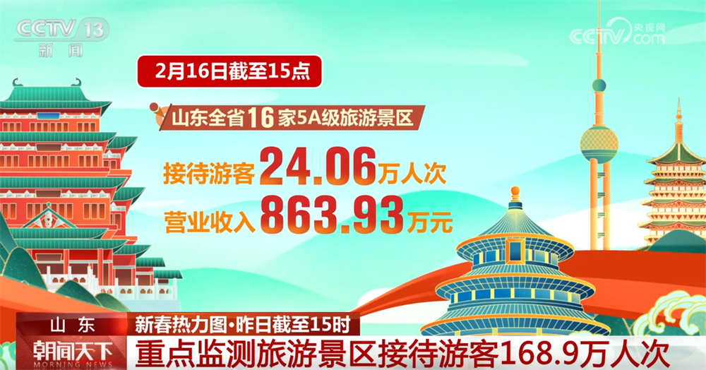 在山东,16日截至15点,全省重点监测的200家旅游景区共接待游客168.9万人次,营业收入8973.5万元,与去年除夕相比,分别增长11.1%和10.3%。