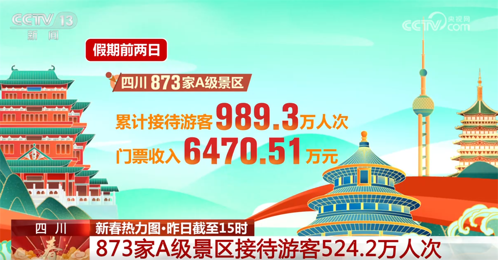 假期前两日,四川纳入统计的873家A级景区累计接待游客989.3万人次,门票收入6470.51万元。