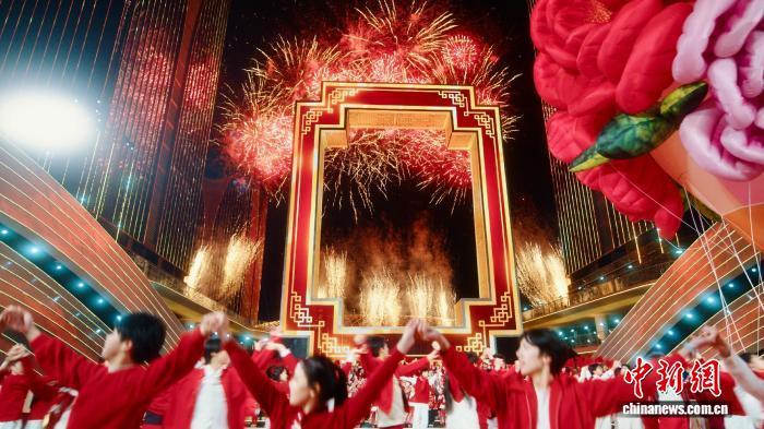 义乌2月17日电(董易鑫)一扇巨型中式窗户矗立于充满科技感的浙江义乌全球数贸中心,舞台向前延展,两侧装饰如潮涌浪花般,铺陈出“勇立潮头”的意象……